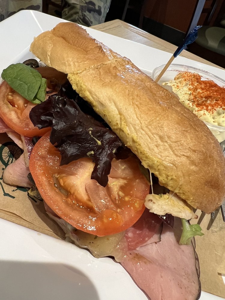 Smoked turkey, Black Forest ham and Black Angus roast beef, provolone, spring mix, tomato, mayo and spicy brown mustard on baguette. Includes a side and pickle spear.