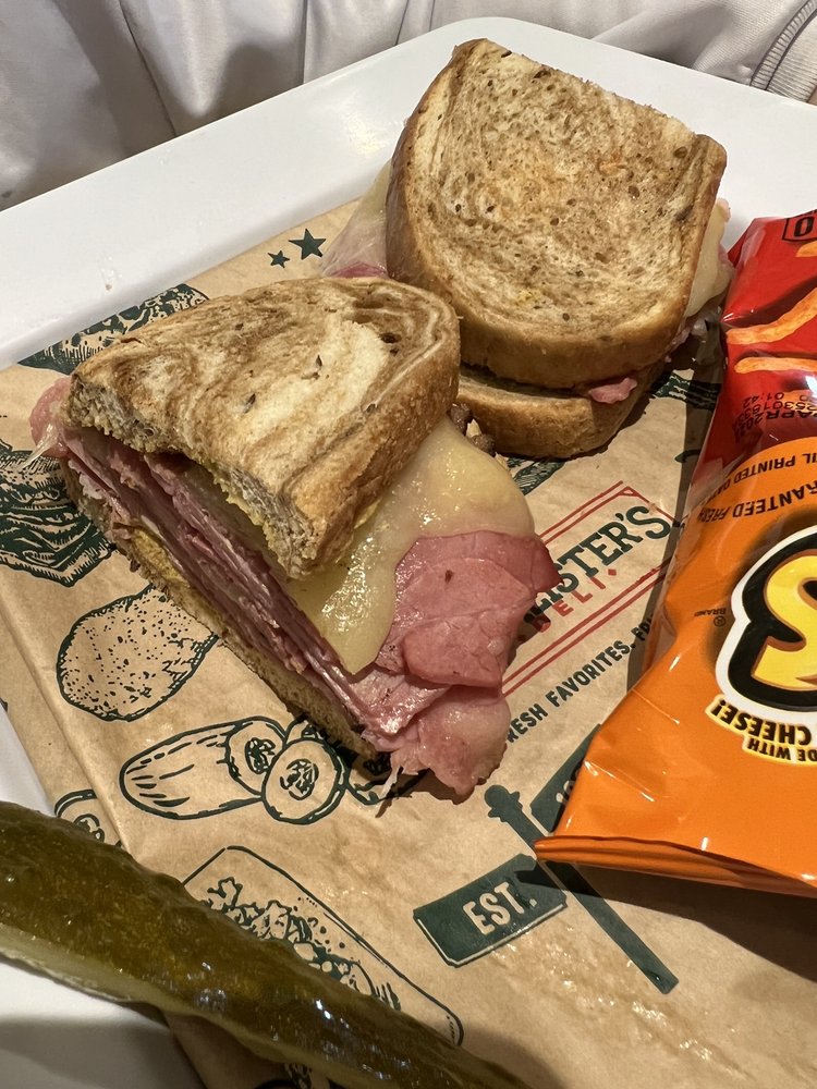 Corned beef, pastrami, Swiss and spicy brown mustard on marbled rye. Includes a side and pickle spear.